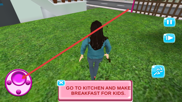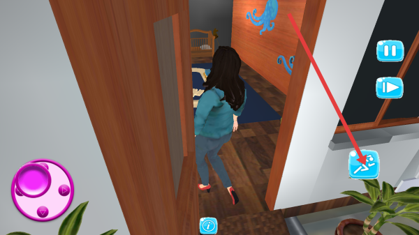 1、通过移动操作,用左下角紫色摇杆控移动方向,按右侧跑步键加速,沿草坪脚印找房屋入口。