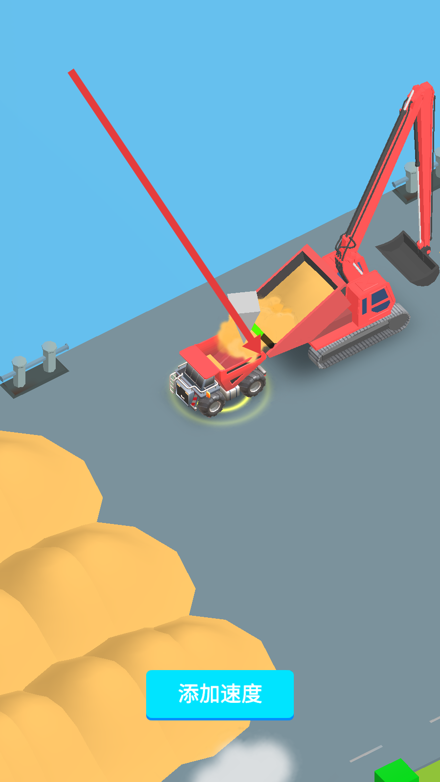 1、对车辆的操作,点挖掘机旁地面指引,控挖掘机装沙,自卸车到位时装沙,点添加速度加快运输。
