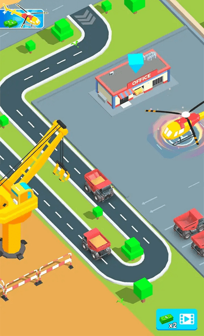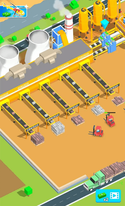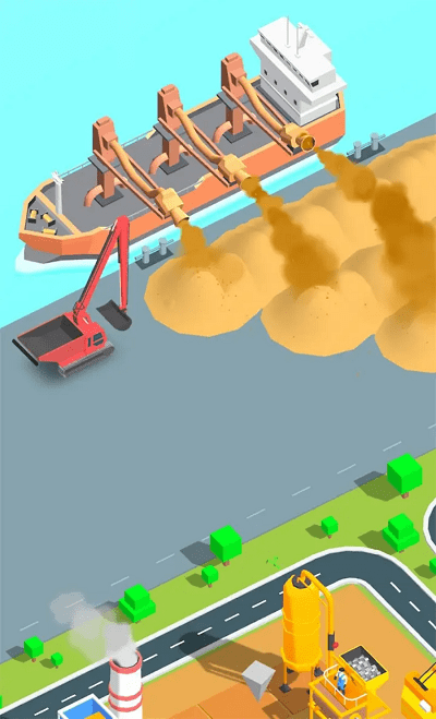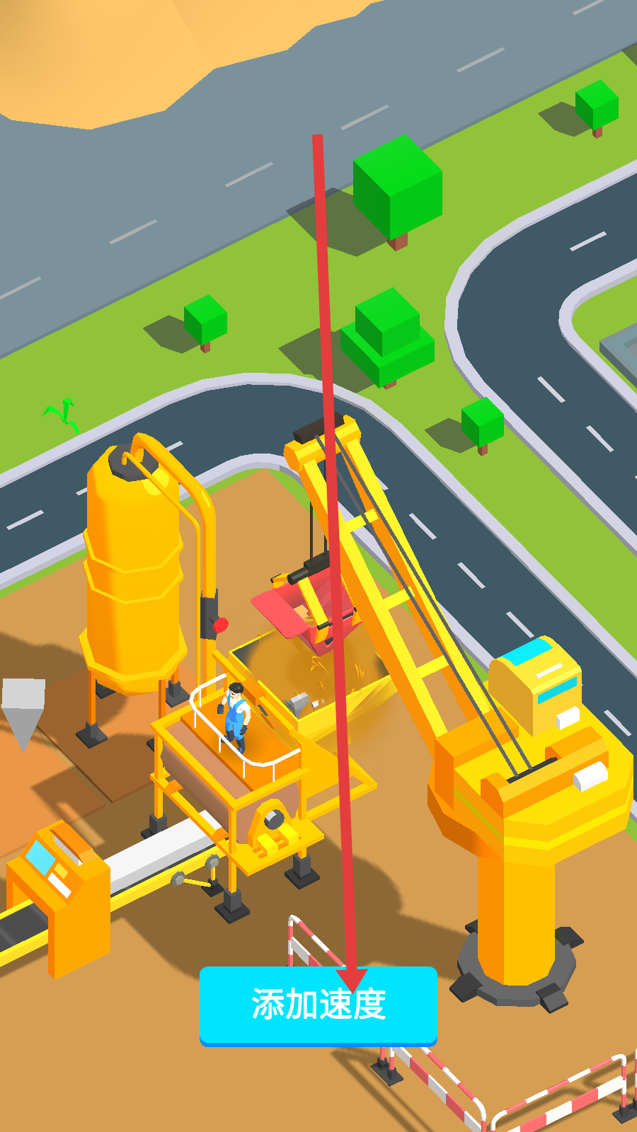 2、工厂的流程,自卸车运沙到工厂,黄色起重机抓沙,按提示点添加速度,提加工效率、推工程建设。