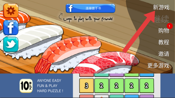 1、有功能选项,点击新游戏方可进入,寿司食材展示、难度提示,呈现模拟经营或益智玩法的启动场景。