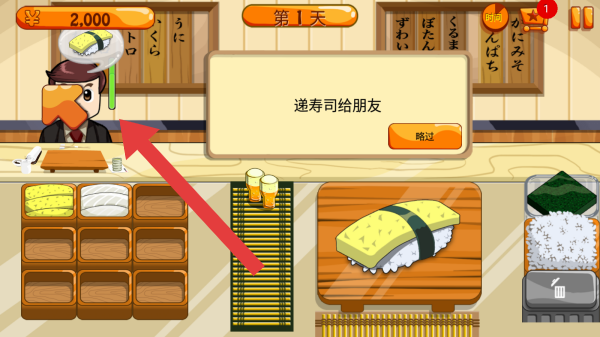 2、第1天经营进度,根据点饭的操作提示及略过按钮,还有寿司店的食材米饭、海苔等,日文菜单装饰,呈现模拟经营寿司店的进程。