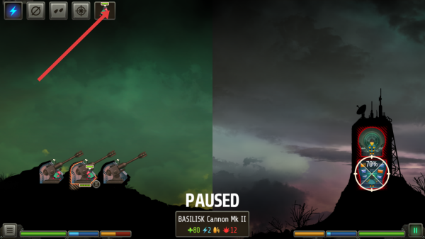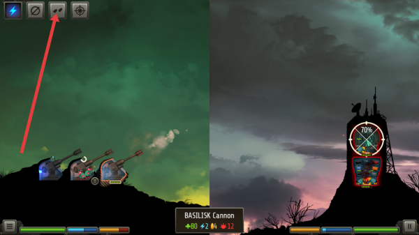 2、查看炮台的操作,对战中点上方技能图标如双边的图标,给对应炮台附加效果,选中炮台,依敌方塔楼位置。