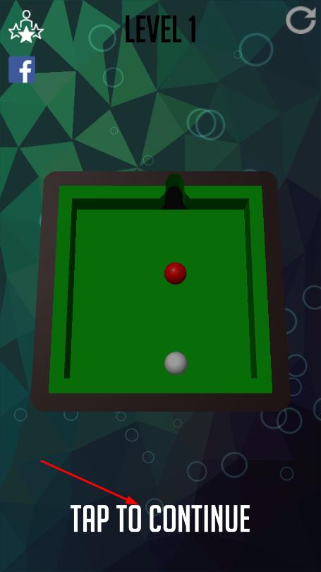 1、进入关卡1,点击TAP TO CONTINUE开始,操控白球,瞄准目标球,调整击球方向、力度。