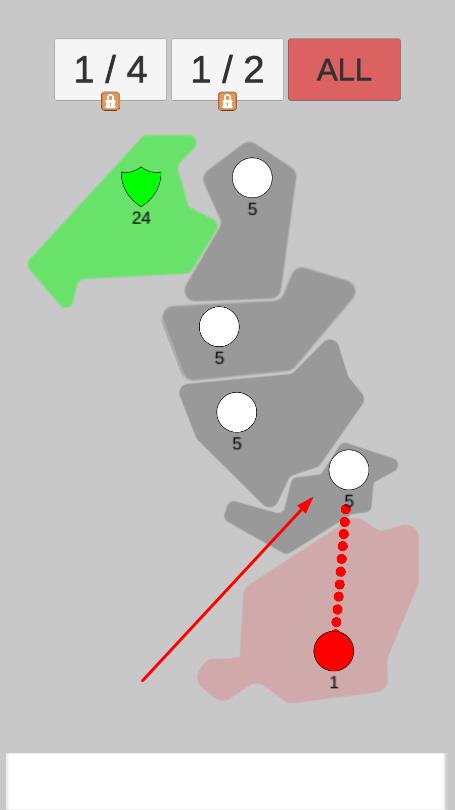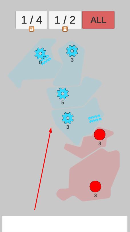 2、观察地图,绿色区域是己方或可占领区域,灰色区域有敌方兵力,红色区域是敌方主基地,点击灰色区域,派遣兵力进攻。