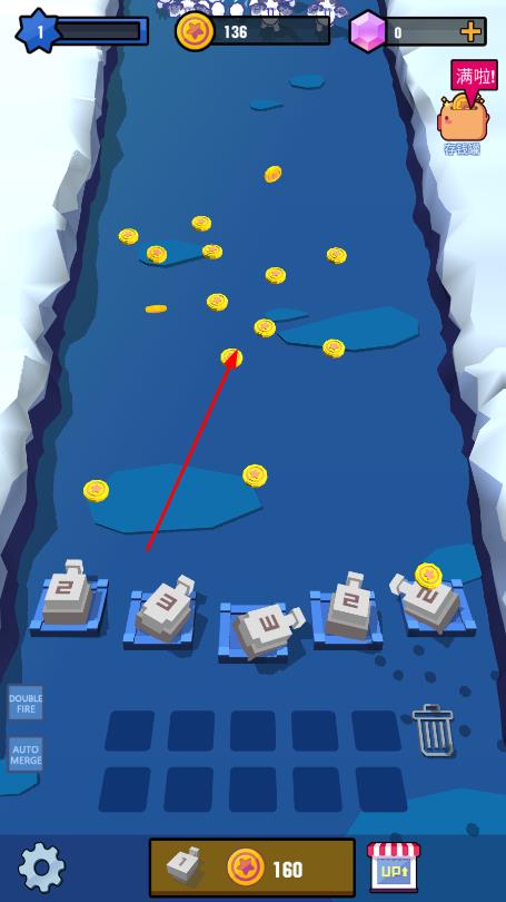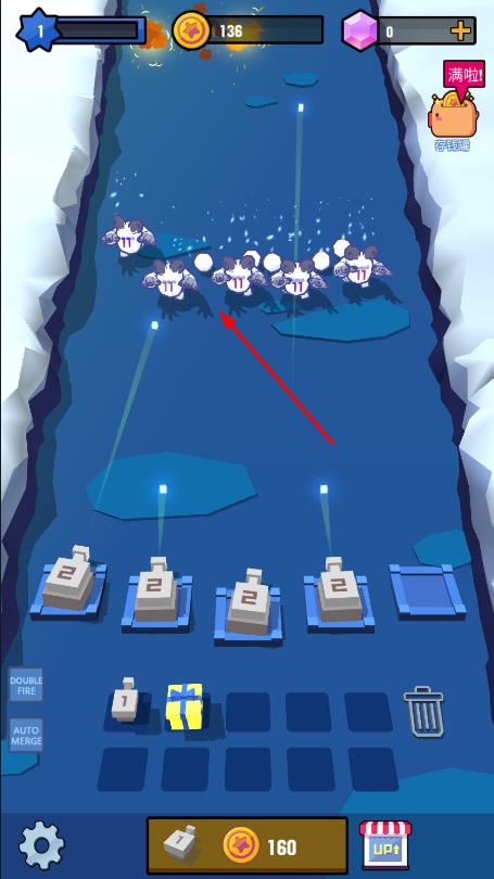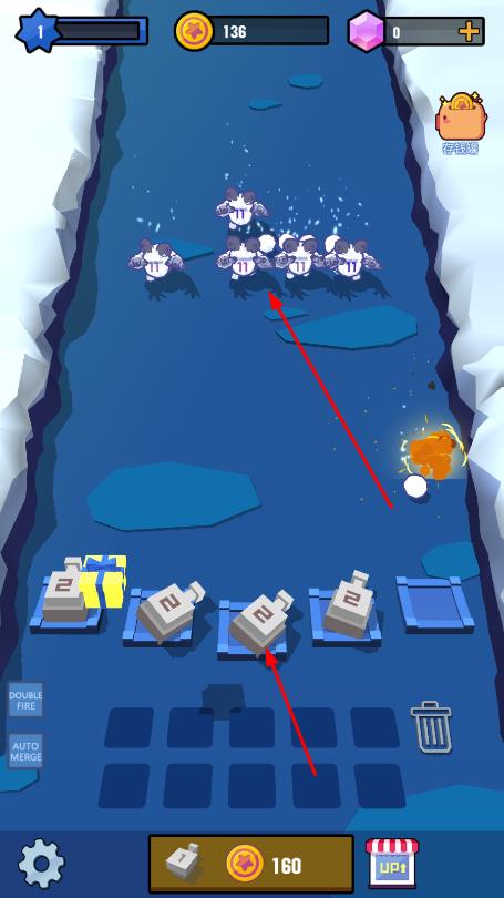 1、在冰面赛道场景,下方有数字方块,点击可合成放置或升级炮塔。