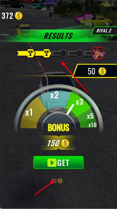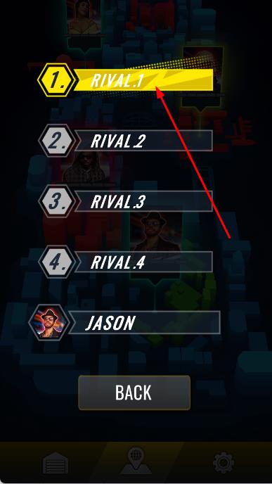 1、在对手选择界面,点击RIVAL1,进入停车场赛道,蓝色与白色赛车通过红绳连接拔河。