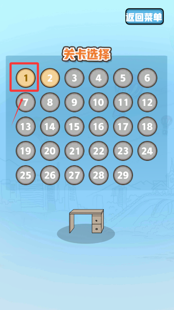 2、然后再点击红色框框的1关卡进入游戏。