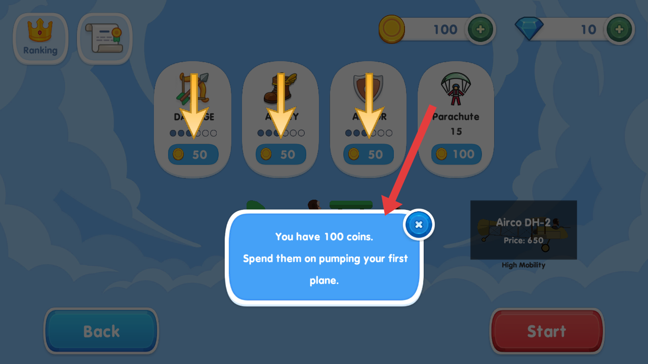 1、进入升级的界面,利用100金币,可以选择升级初始飞机的Damage、Agility、Armor属性。
