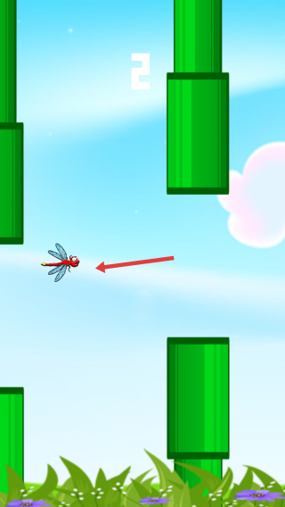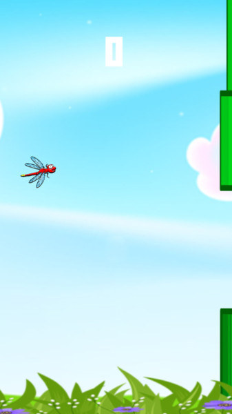 2、游戏中通过点击或滑动,控制蜻蜓上下移动,穿越管道间隙前行。