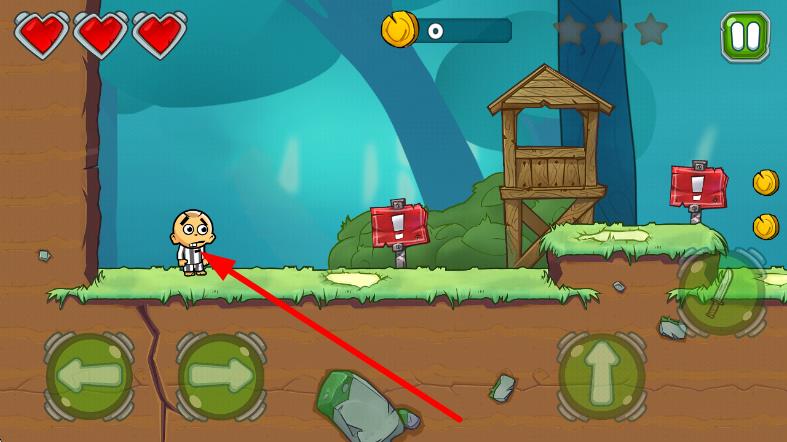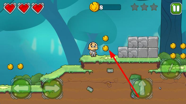 3、引导角色沿箭头方向前进,跳跃石块,收集金币,提升金币数量,完成关卡目标。