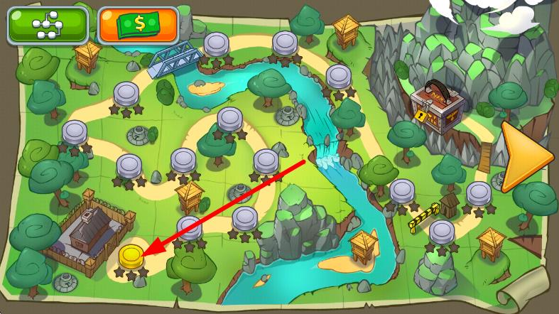 1、在地图界面,点击箭头指向的金色硬币图标,进入对应关卡,开始冒险,收集金币。