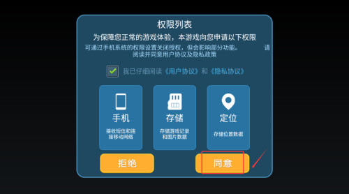 1、首次启动需阅读用户协议,点击确认按钮后进入游戏主界面。