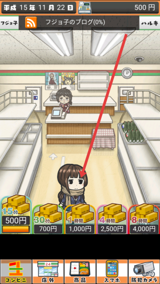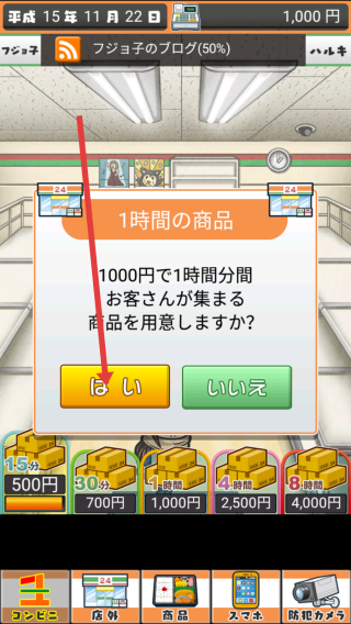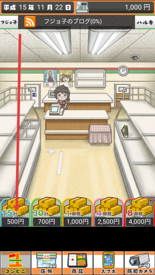 1、进入游戏页面初始经营,进便利店,点下方商品筹备如15分或者500円,耗货币备货引顾客。