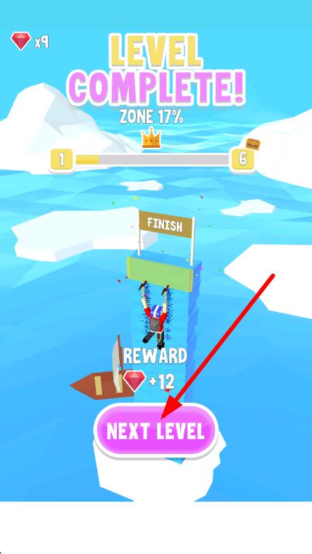 3、完成后,点击NEXT LEVEL按钮,领取钻石奖励,进入下一关,挑战更高难度的冰山攀爬。
