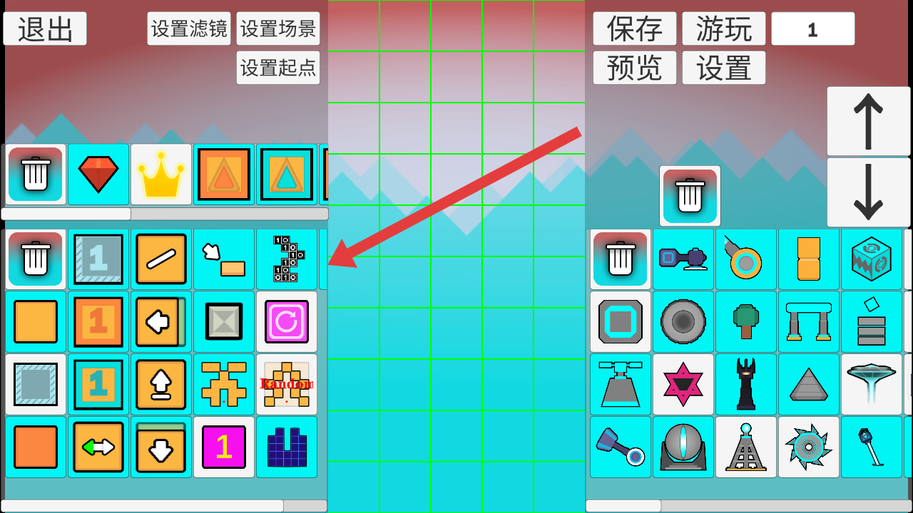2、在编辑的模式中,可以选择从左侧的道具栏选取图标,拖至中间网格区域,搭建游戏场景。