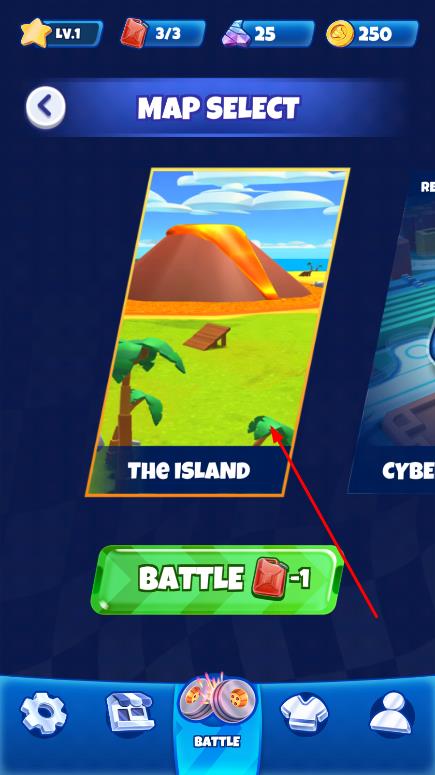 1、点击START,进入地图选择,选THE ISLAND等地图,消耗1个道具,点击BATTLE开始比赛。