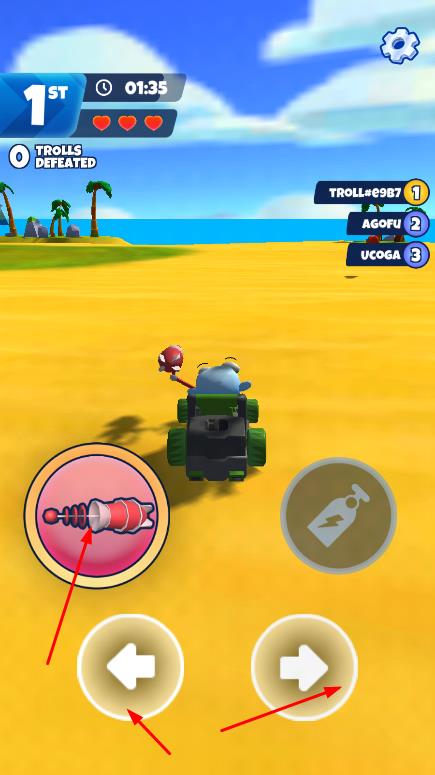 2、在赛道驾驶卡丁车,通过左右箭头按钮控制方向,点击技能按钮释放道具,攻击对手。