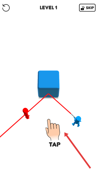 1、进入到LEVEL-1界面,点击TAP位置,让红蓝小人借助红线互动,合力推动蓝色方块完成关卡。