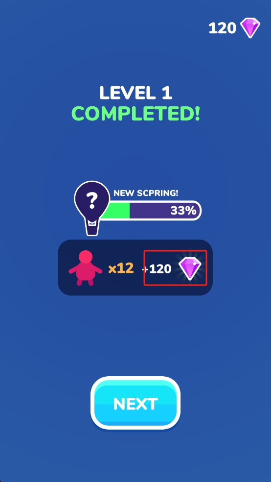 3、关卡胜利后会获得120钻石与12个小人,点击蓝色NEXT按钮进入下一关,可利用资源解锁道具助力后续挑战。
