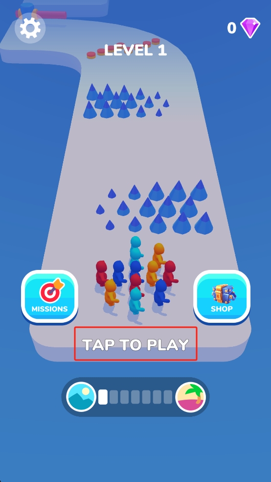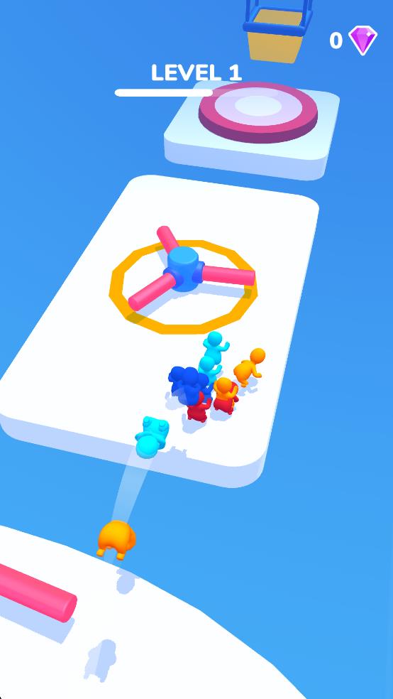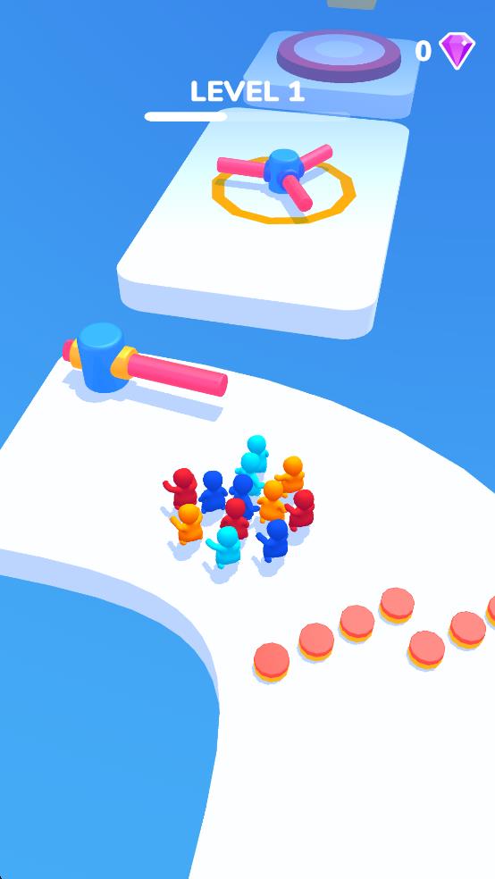 2、跟随白色手指指引,让小人聚集在红框区域,借助滚动惯性通过路段,拾取橙色圆饼,躲避蓝色碎块,维持队伍人数。