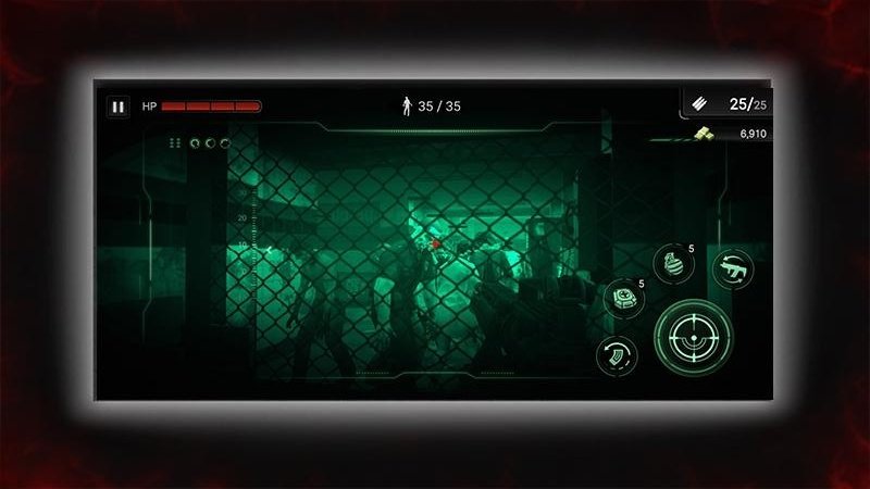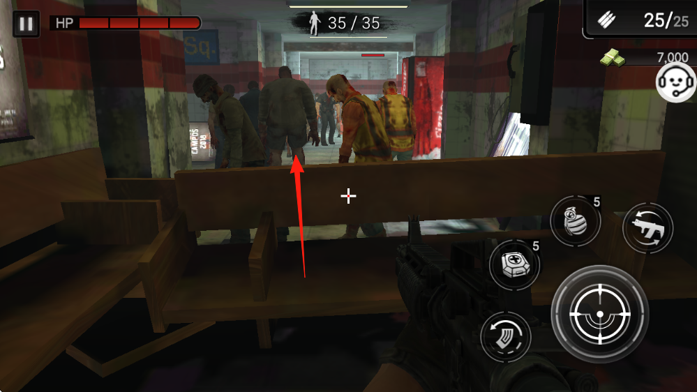 1、在室内场景医院废弃建筑,操控角色持枪械,射击僵尸箭头指引目标,留意HP血量、剩余人数35→25。