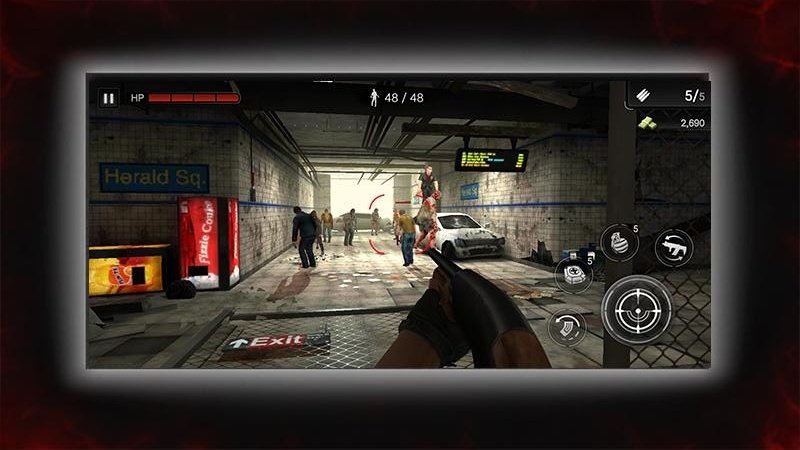 2、点击右侧瞄准、技能按钮手雷、武器切换,攻击僵尸,清理区域,推进关卡。