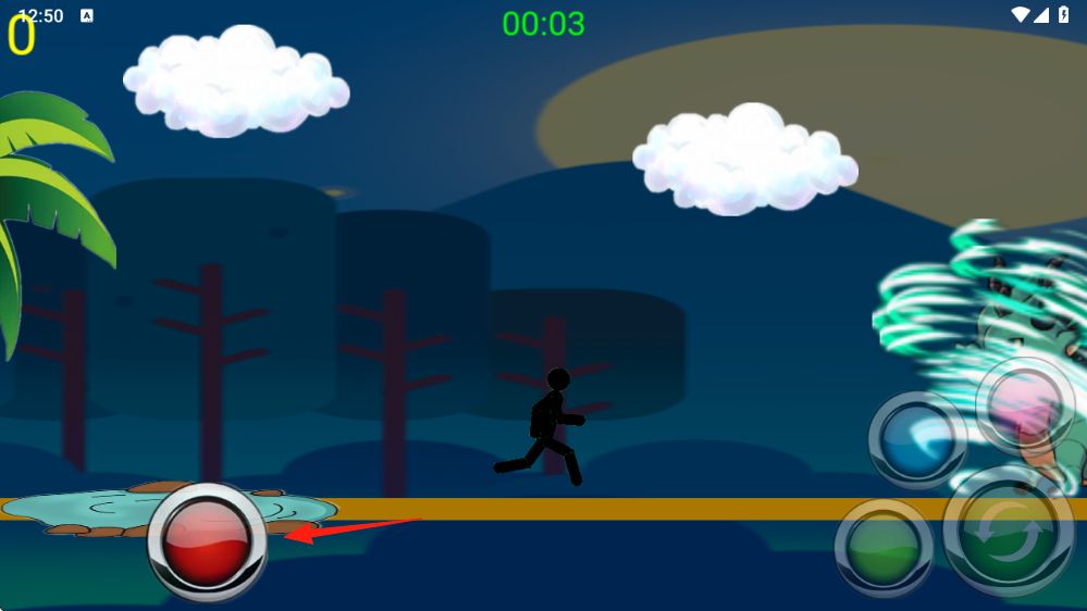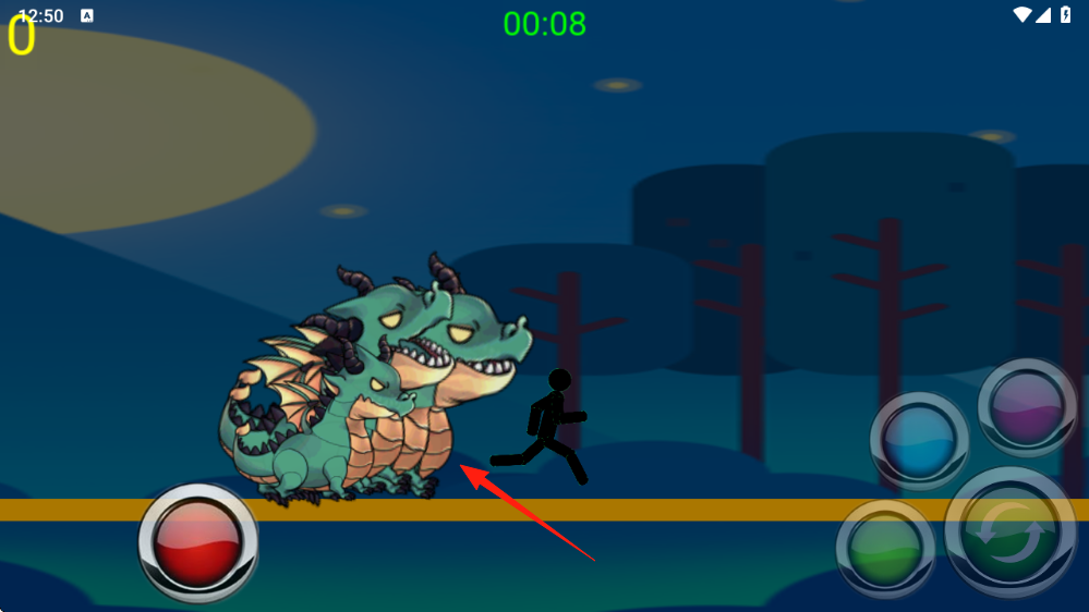 1、控制火柴人,在夜晚山林场景奔跑,躲避神龙单头-多头攻击,留意倒计时00:08→00:03。