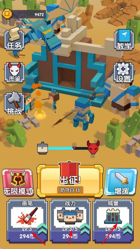 1、在主界面,可消耗金币升级画笔,战力,城堡等属性,点击出征,进入防守关卡。