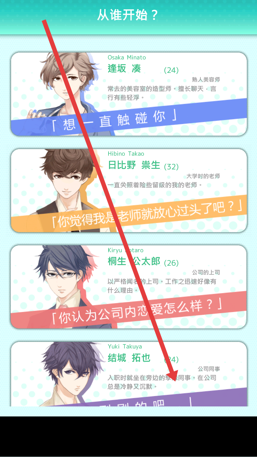 1、开启游戏,可选择自己喜欢的角色开启剧情,比如结城拓也,他是公司同事,入职时坐在旁边。