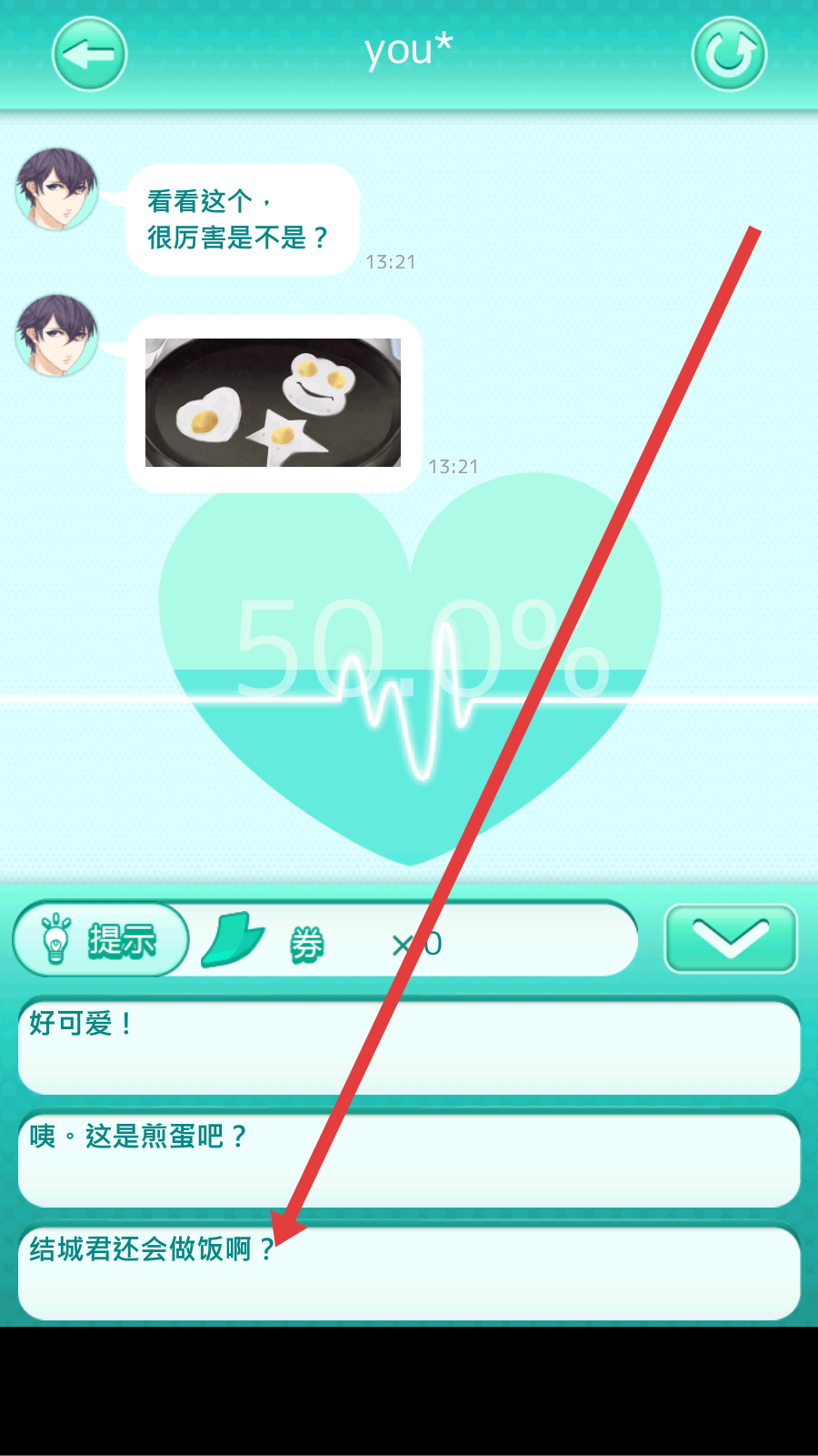 3、聊天时角色分享日常的相关内容,可选择结城君还会做饭啊这类回应,能表现出对角色的惊喜感,有效提升与角色的好感度。