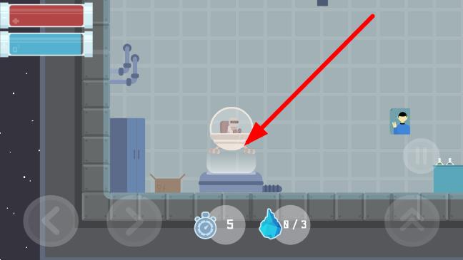 3、操控箭头指向的太空舱,在空间站场景移动,收集蓝色水滴,推进剧情。