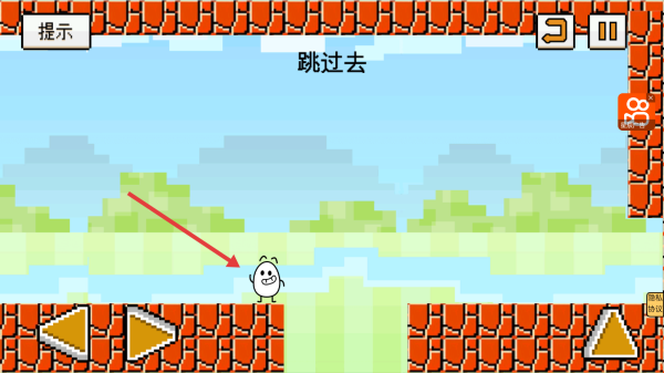 3、在场景中,操控角色在关卡内移动,界面会显示提示、跳过等功能按钮,当提示跳过去时,可利用跳跃功能让角色越过障碍。