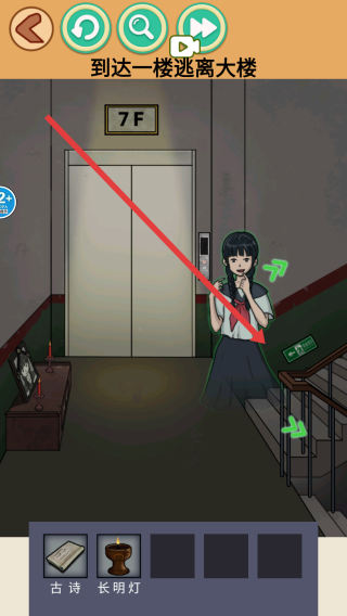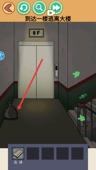1、选择关卡,查看任务,为到达一楼逃离大楼,初始位于8F时,先收集道具古诗,同时留意电梯与楼梯路线。