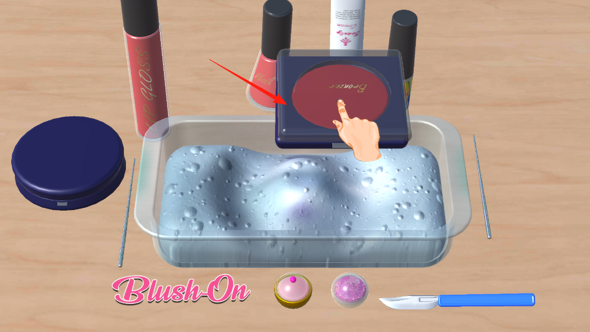 2、来到美妆史莱姆制作步骤,界面呈现腮红等物品,点击腮红盒,取用腮红,添加到史莱姆中,通过点击操作,精准投放材料,推进史莱姆制作,感受细节调配的机制。