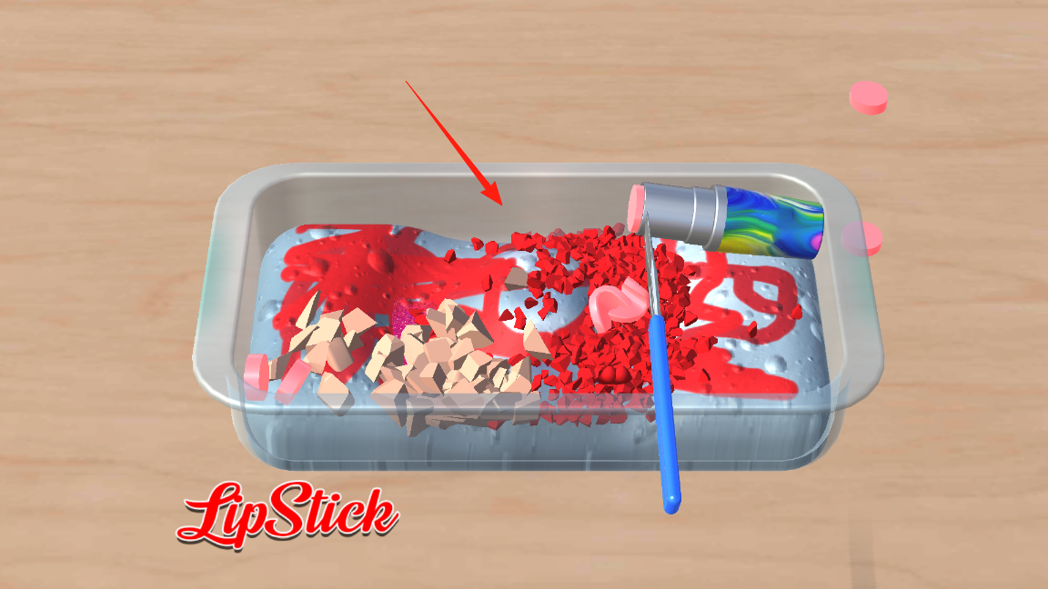 3、进入口红添加环节,界面显示口红碎块与工具,拖动工具,将口红碎块混入史莱姆,借助拖动操作,让材料充分融合,完成口红添加步骤,体验材料混合的独特流程。
