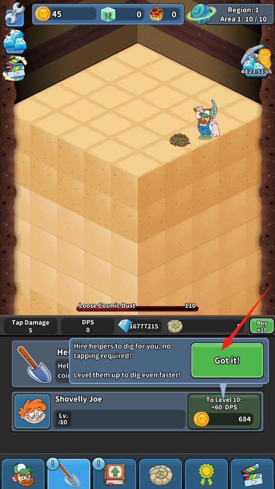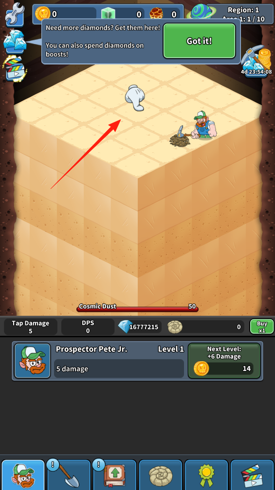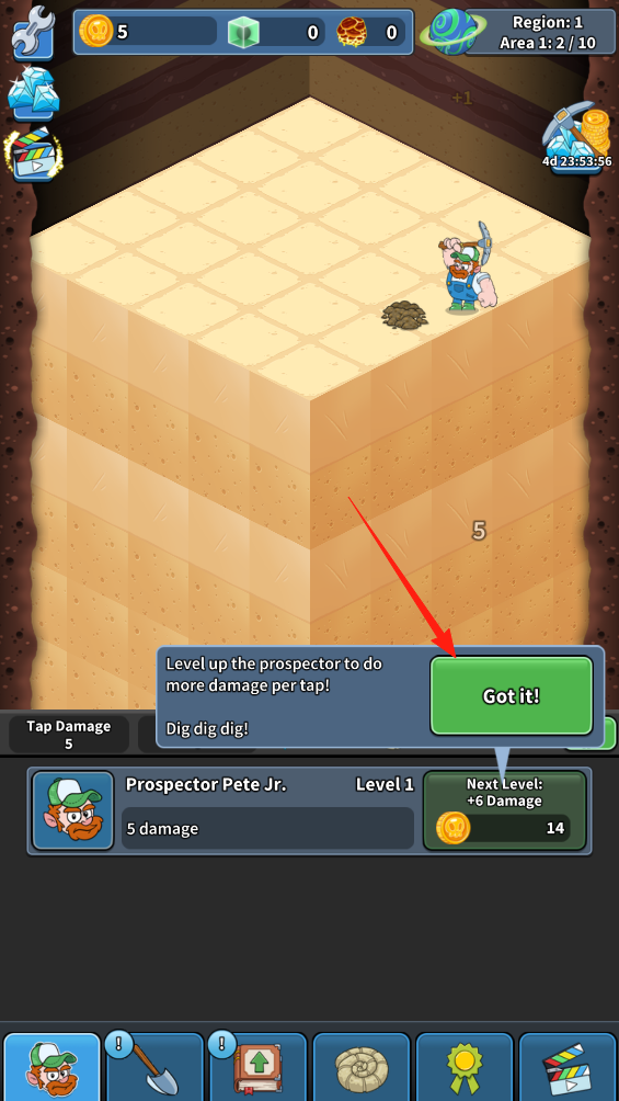 2、挖掘过程中弹出提示框,显示提升角色等级可增加点击伤害,点击Got it关闭提示,消耗金币升级角色,升级后,角色挖掘效率提升,更快开采地层,强化挖矿能力。