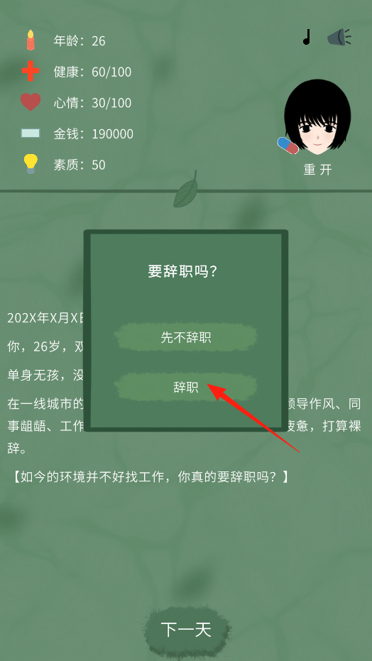 1、在角色状态界面,遇到辞职抉择弹窗,根据自身情况,选择辞职或先不辞职,不同选择会改变后续人生轨迹,通过决策,推进剧情,感受人生模拟机制。