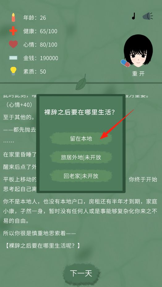 2、裸辞后进入生活地点选择环节,弹窗呈现留在本地,旅居外地等选项,点击留在本地,依据角色背景,开启对应生活支线,体验本地生活的发展可能,延伸人生模拟剧情。