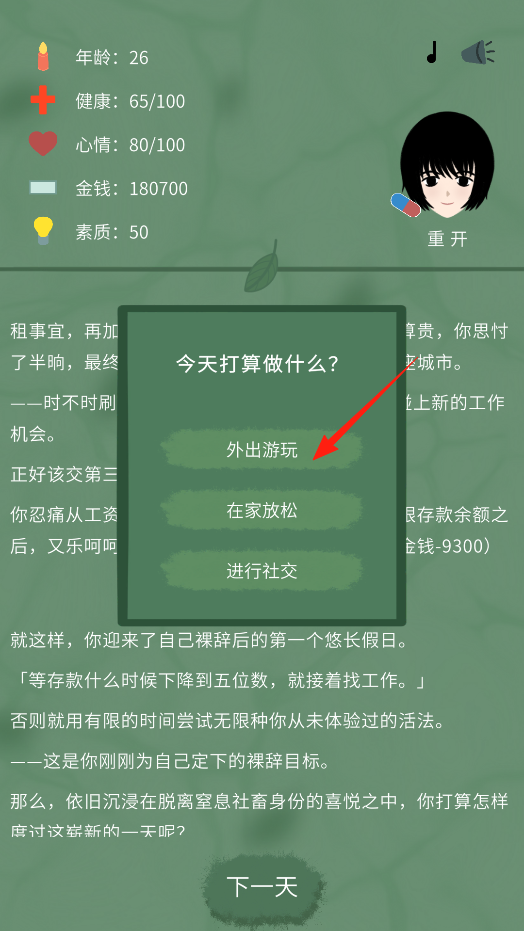3、在裸辞后的日常规划界面,弹窗有外出游玩,在家放松等选项,选择外出游玩,消耗金钱,提升心情,通过日常活动选择,丰富人生模拟内容。