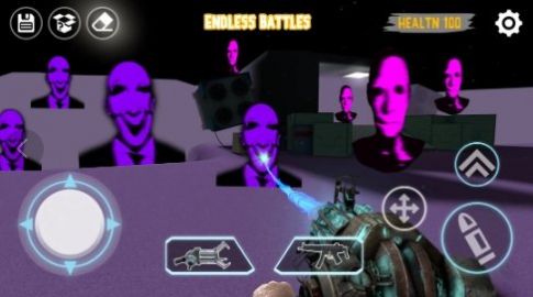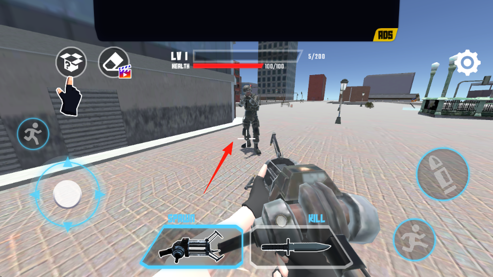 1、进入游戏后根据红色箭头指示,前方有敌人入侵,右侧按钮射击、切换武器枪、刀,瞄准敌人士兵攻击。
