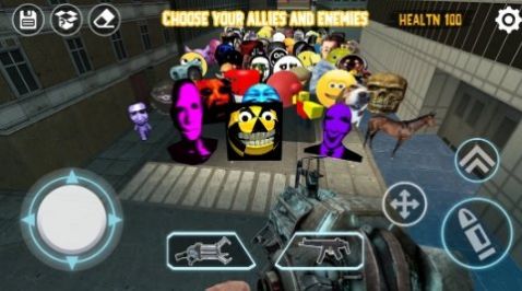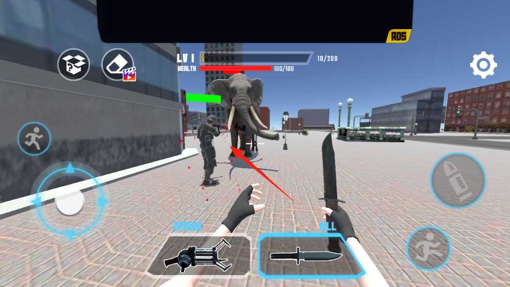 3、前方敌人正在攻击大象,可以用左侧摇杆移动角色,中间按钮有枪和刀可以切换,切换到刀,瞄准敌人大象攻击。