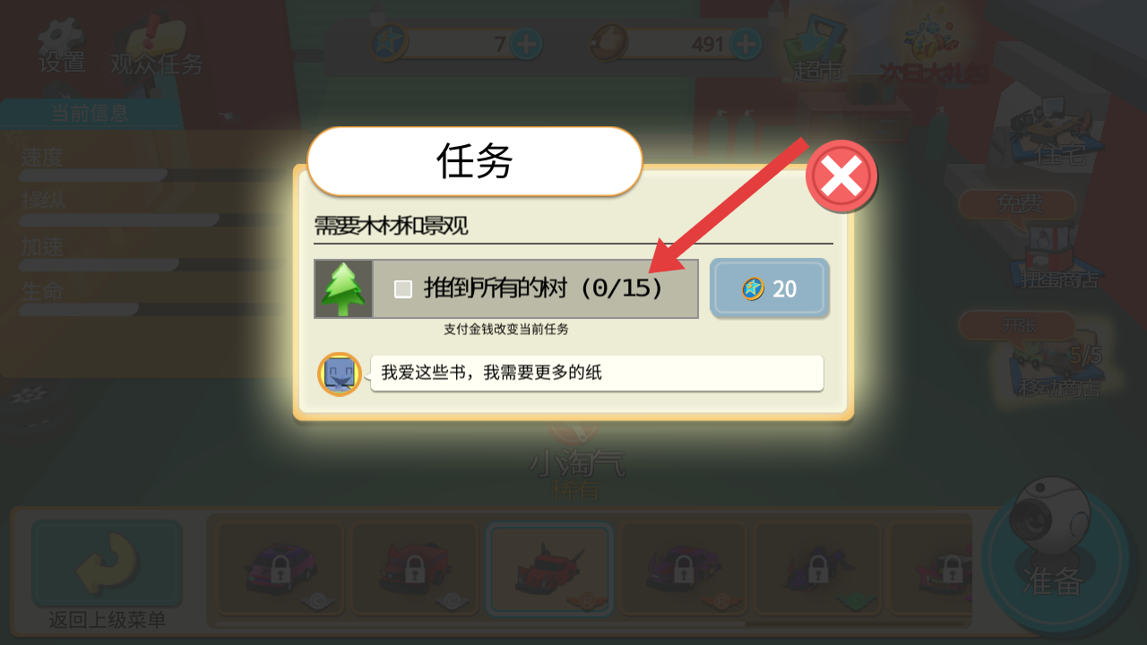 3、接收到任务驾驶车辆推倒所有的树0/15,完成目标可以获20星星奖励,用于兑换游戏的增益道具。
