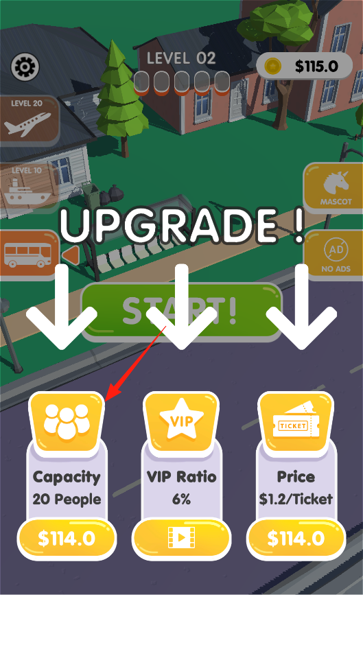 1、在升级界面,点击Capacity选项,消耗金币提升载客量,升级后,能搭载更多乘客,为后续运营积累资源,借助升级操作,强化业务能力。
