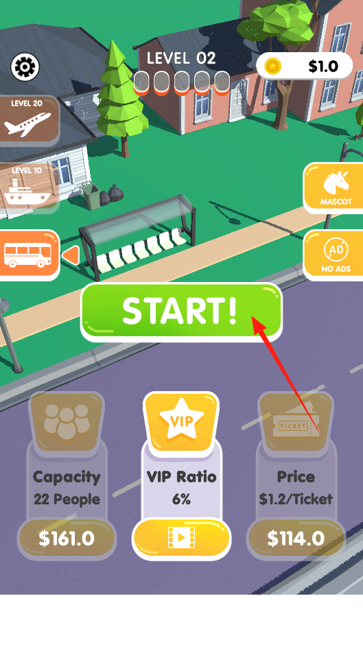 2、完成升级后,点击绿色START按钮,开启运营流程,车辆出发,搭载乘客,按照路线行驶,获取金币收益,通过启动运营,推进游戏进程,体验载客赚钱的玩法。