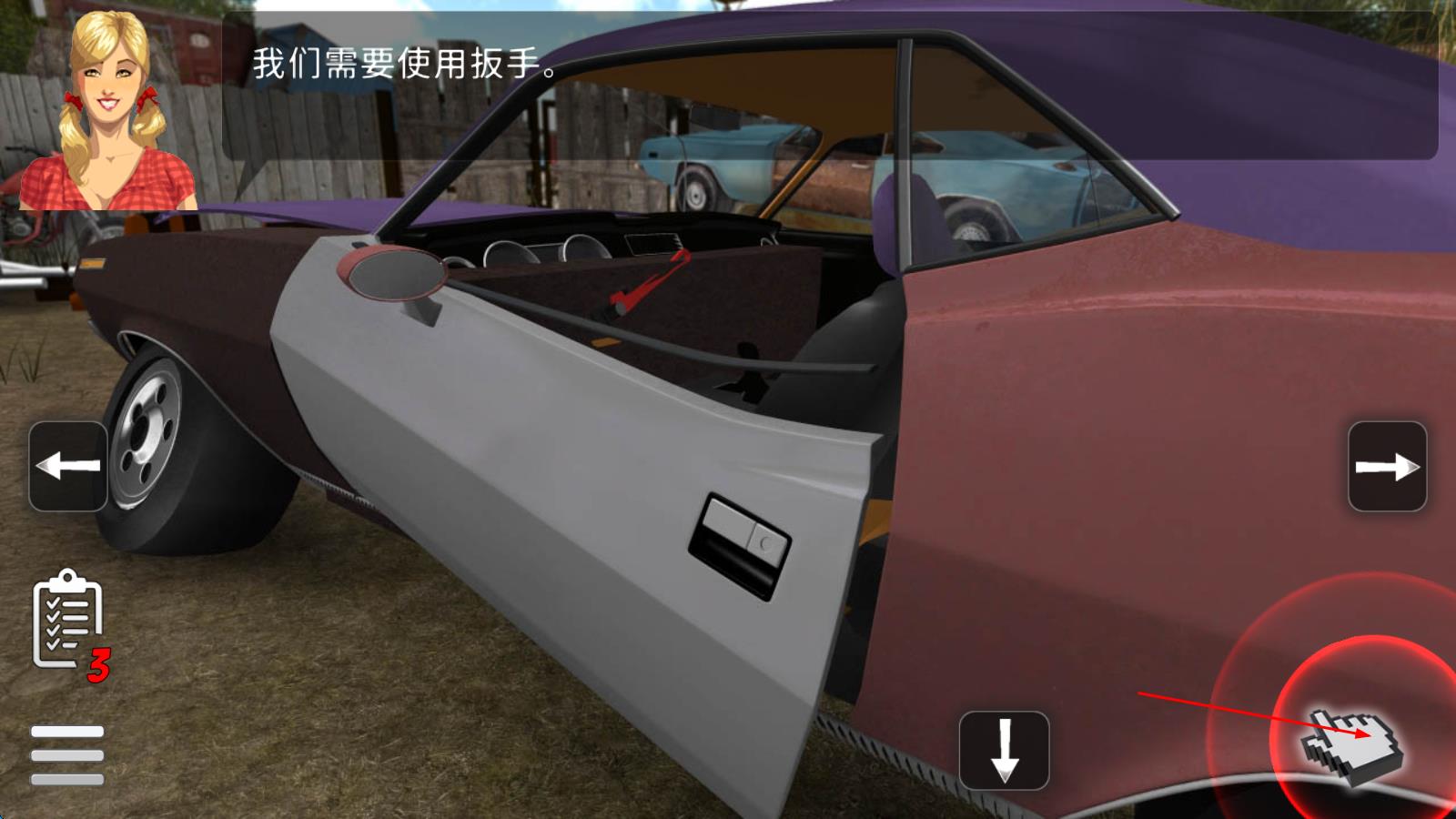1、进入游戏,面对待修的废弃汽车,跟随初始任务指引,学习寻找基础工具与零件,尝试完成简单的部件更换,开启修车之旅。