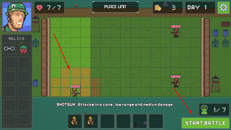 2、拖动士兵至指定区域放置,利用不同兵种特性,点击START BATTLE,让士兵迎战敌人,守护阵地。