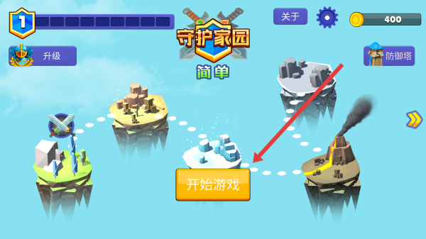 1、在守护家园游戏界面,通过箭头提示,点击开始游戏按钮,进入简单难度的关卡挑战。