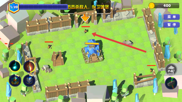2、游戏中沿箭头指引方向,需要观察敌人出没方向,提前准备好迎击来犯敌人保卫城堡。