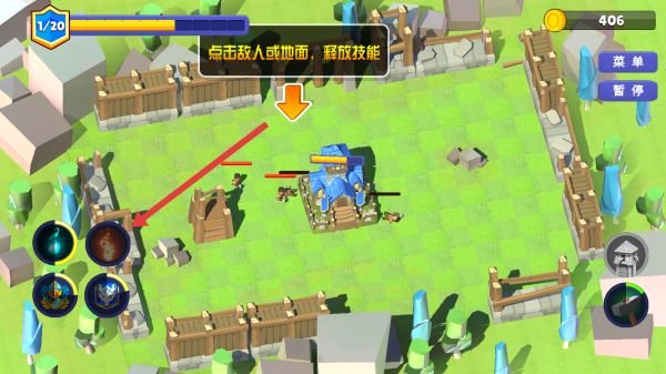 3、遇敌人时,可以点击左侧技能图标,再次点击敌人位置释放技能攻击敌人,助力守卫城堡完成关卡。