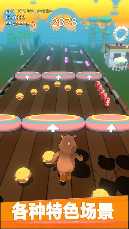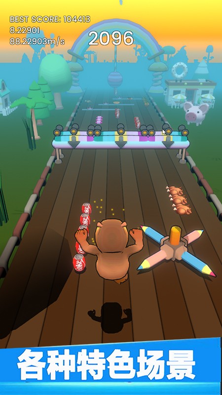 1、主题场景轮换设计,包含丛林、沙漠、雪地等8种截然不同的环境风格,每种主题都会改变障碍物类型和机关特性。